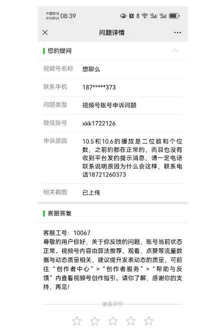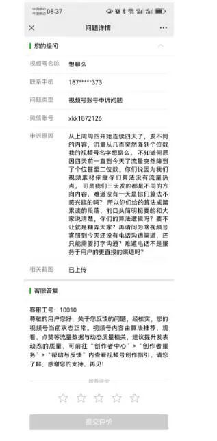 还是只是因为要拿一天工资,而发我复信息吗?最后想说有我这样的问题视频号账户一定很多,别人一定也会碰到我这样的问题,视频号这样对待一个使用其生产软件的用户,也会这样对待其他的用户。
