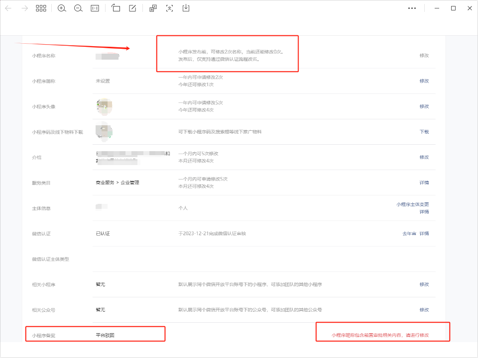 个人小程序一年只能改两次名字,但是备案昵称没通过,现在名字也无法改那要怎么整?