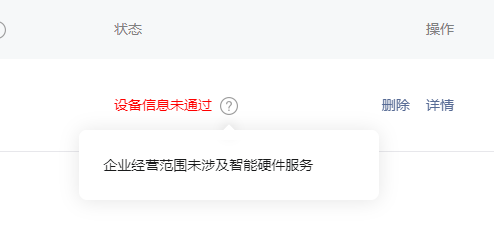 添加硬件设备后被驳回,驳回原因是【企业经营范围未涉及智能硬件服务】,企业本身是做集成电路设计的,设计的集成电路产品会用到像乐鑫这样的无线芯片,这时候会用到比如AirKiss配网这样的操作,那么就申请了小程序里面的硬件设备功能,主要是想拥有长期订阅的消息,可以方便使用者接收到设备反馈的消息,这样不用使用者每次都去点一下订阅消息。