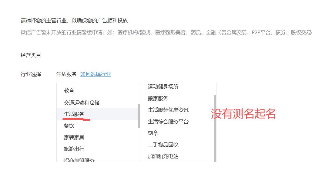 申请成为广告主时,行业选项里没有“生活服务/测名起名”这个选项,如何选择行业?