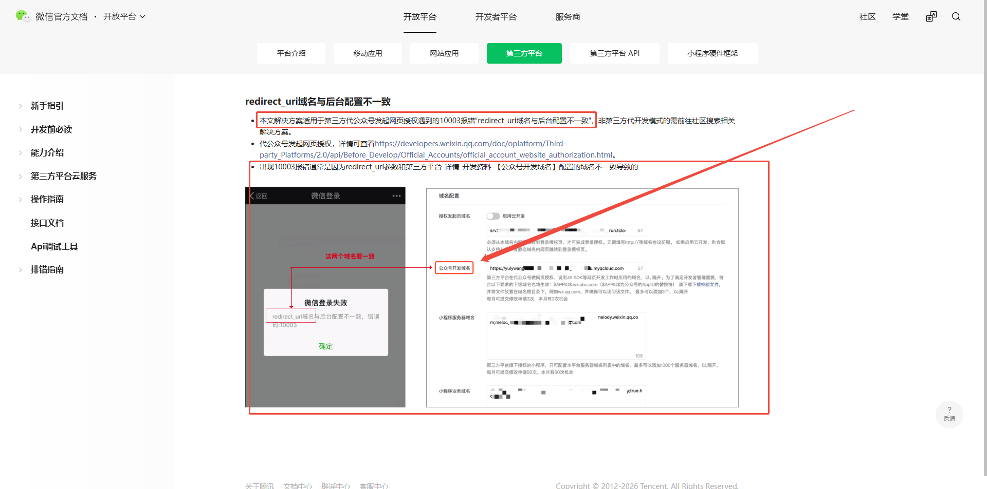 排查文档,有一样的问题文档:https://developers.weixin.qq.com/doc/oplatform/Third-party_Platforms/2.0/troubleshooting/10003.html#redirect_uri%E5%9F%9F%E5%90%8D%E4%B8%8E%E5%90%8E%E5%8F%B0%E9%85%8D%E7%BD%AE%E4%B8%8D%E4%B8%80%E8%87%B4