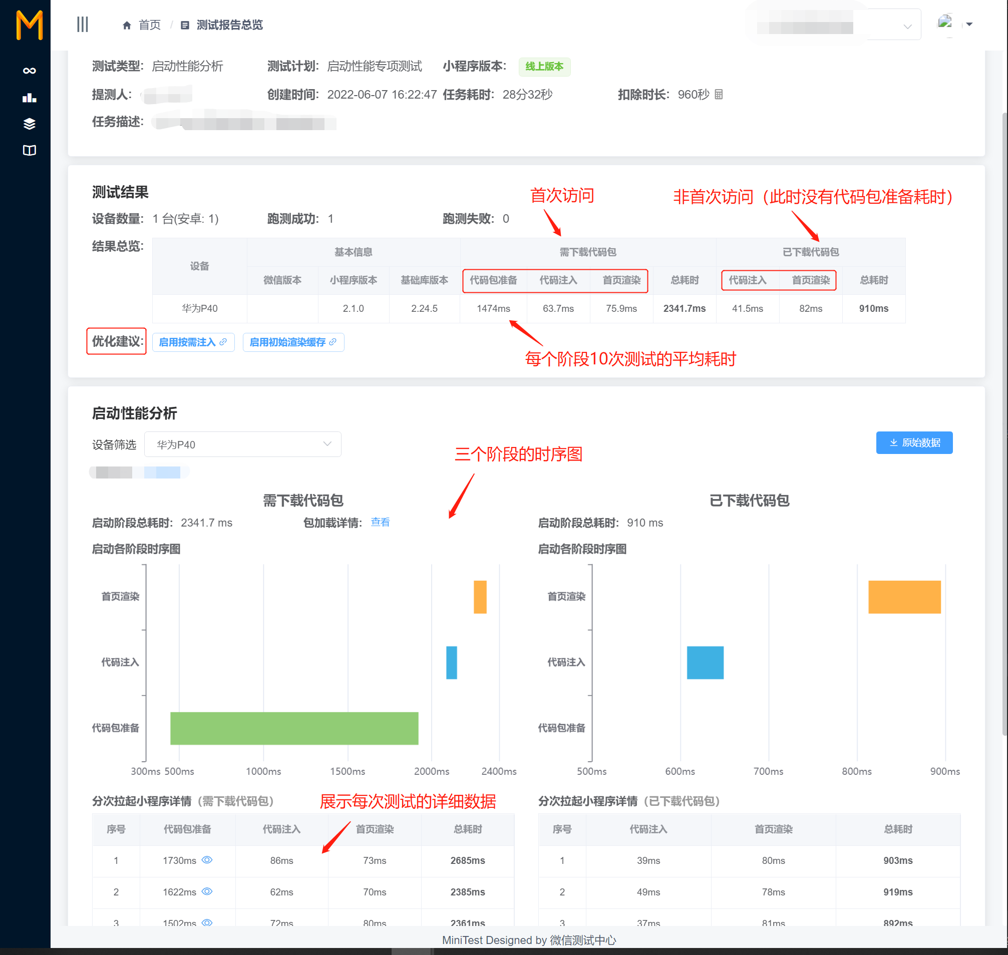 在启动性能分析的测试报告中,展示了用户首次访问(需下载代码包)以及用户非首次访问(已下载代码包)两种情况的测试结果,并通过时序图展示了平均耗时情况分布,让用户可以清晰看到耗时分布情况,并给出优化建议,帮助用户针对性地提升小程序启动性能