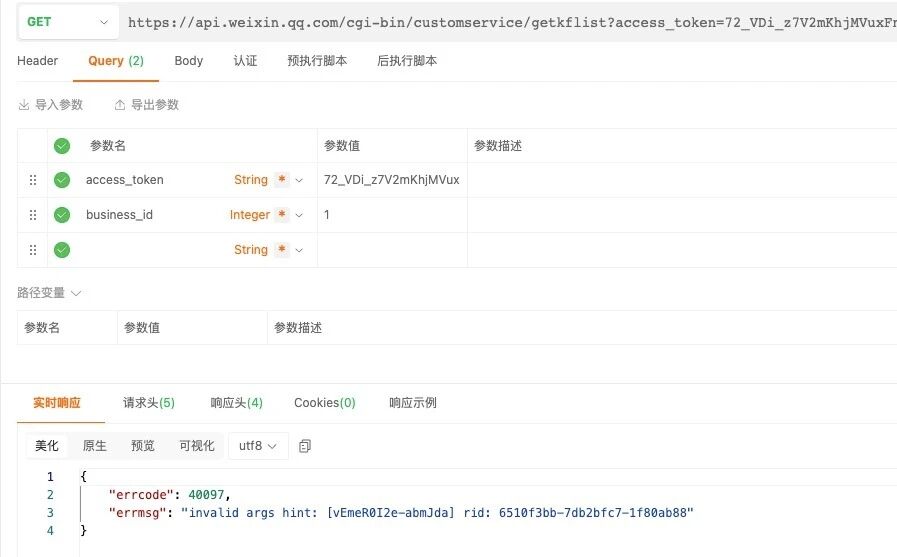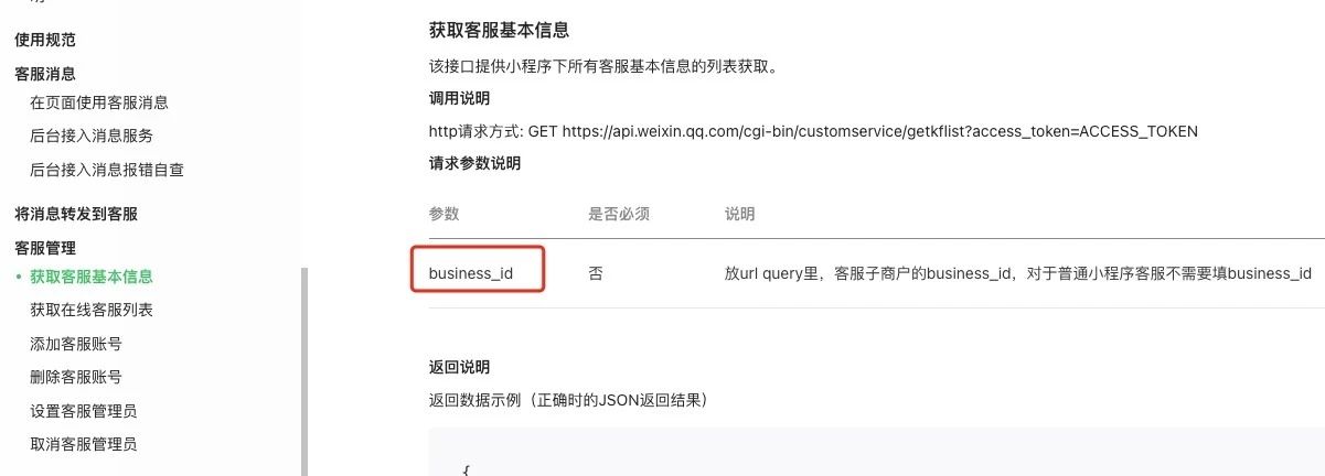 获取客服基本信息接口带business_id参数时接口无法调用,返回如下信息,另外“添加客服账号”接口也同样问题。卡在这里无法进行下去。