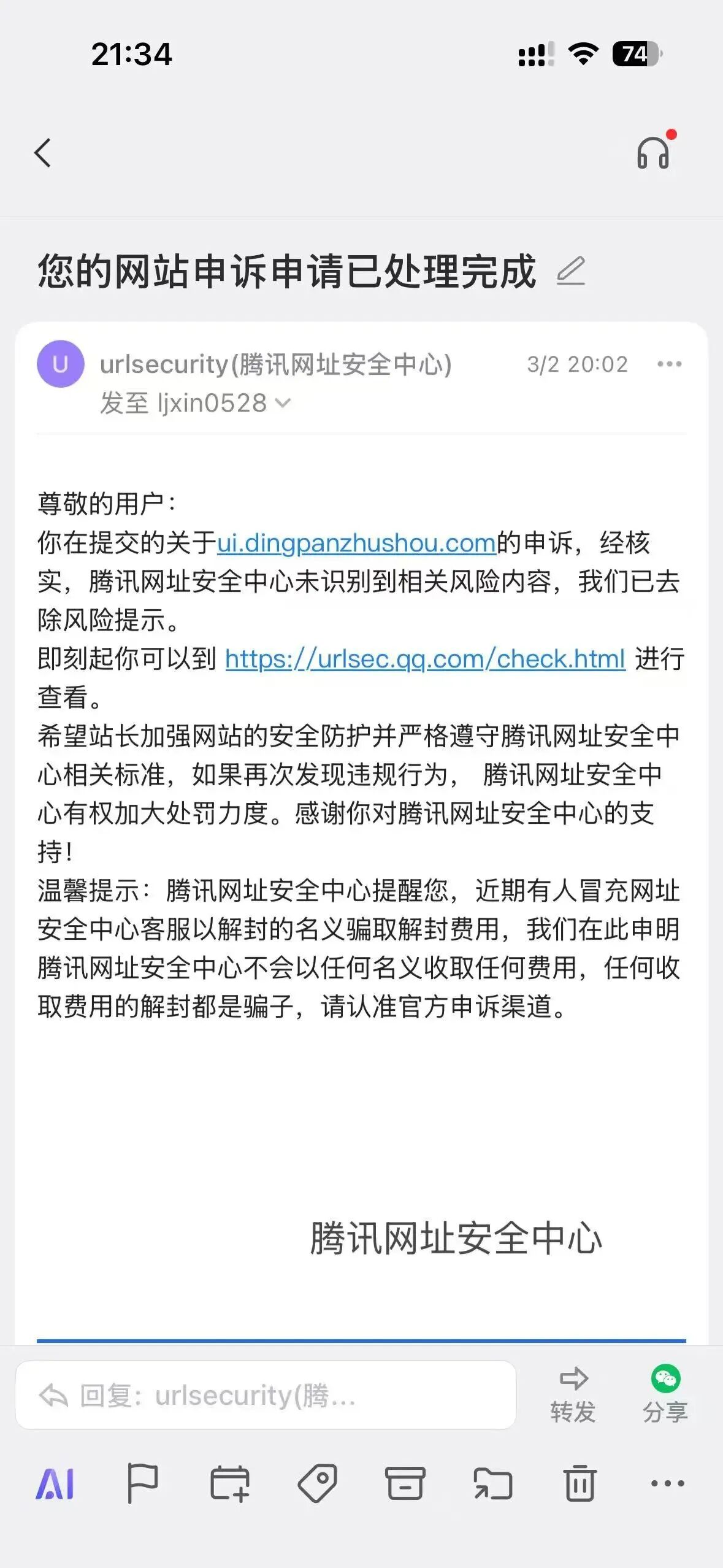 我们的网址https://ui.dingpanzhushou.com,微信服务号菜单链接,我们的网站已完全合规合法,内容不涉及违规信息,但依然被微信拦截。请协助核查具体原因并提供解决方案