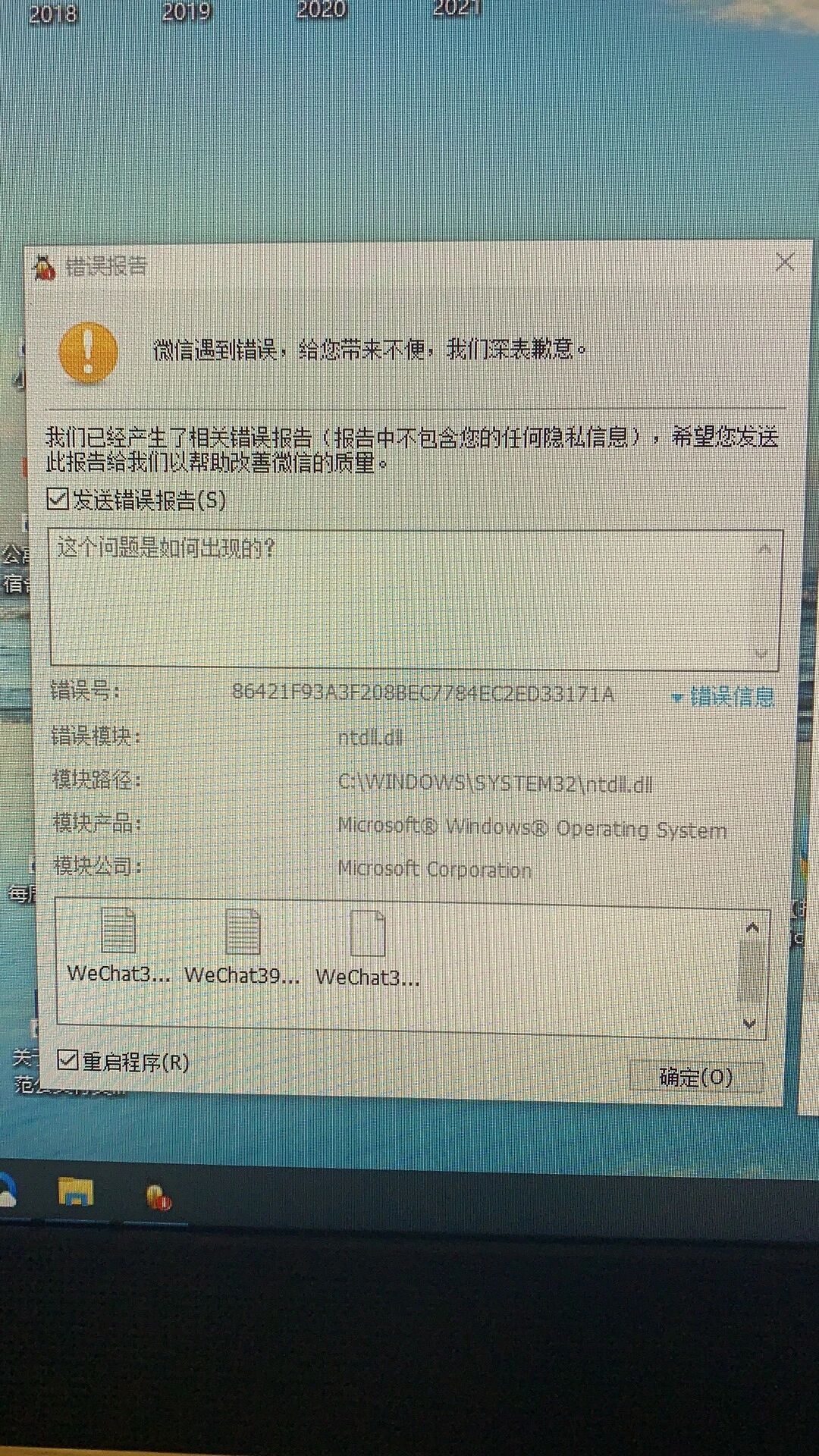我的刚刚出现微信错误模块 我把dll 库前面的名字更改了就好了 再给的那个路径中搜索错误模块 更改 环境库(dll)结尾的就OK了,我的是装了QQ 输入导致的 。我重装 微信也是不行,所以 得更改库名字。希望能给大家帮助。
