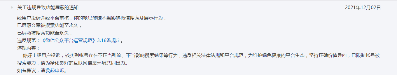什么都没有说清楚就被处罚了,查阅了文章没有发现问题,现在也一年多了,处罚一直在,不能被搜索,也无法迁移,在线客服电话客服联系不上,烦请可以有人员帮我看看,重新查阅给一次机会,让处罚有个期限,一直都是安安分分做的号,也积累了很多粉丝,也算是为公众号平台有出力,真的很冤。