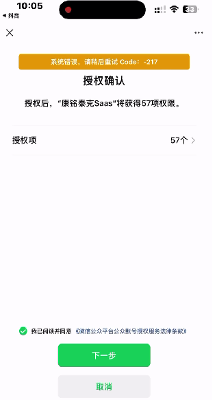 你好,请现在重试下是否可以正常授权成功?若还是不行请提供触发报错时间点、授权账号(公众号/小程序)AppId、第三方平台AppId及提示报错的授权完整链接