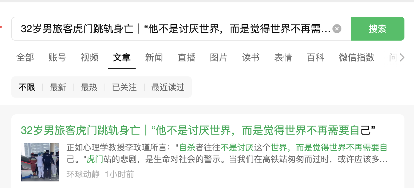 因业务需要,个体工商下的公号注销后又重新注册一个新号,现在该公号所发布所有文章无法搜到。 标题:32岁男旅客虎门跳轨身亡|“他不是讨厌世界,而是觉得世界不再需要自己” 链接:https://mp.weixin.qq.com/s/mGVK05MbH0zv_Uciwdqnrw