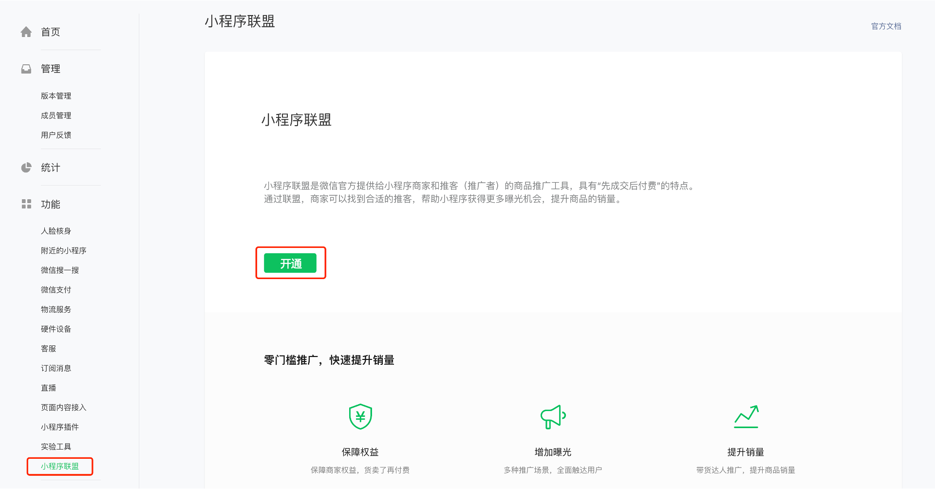 请问小程序开通标准版小商店组件,怎么开通小程序联盟呢?