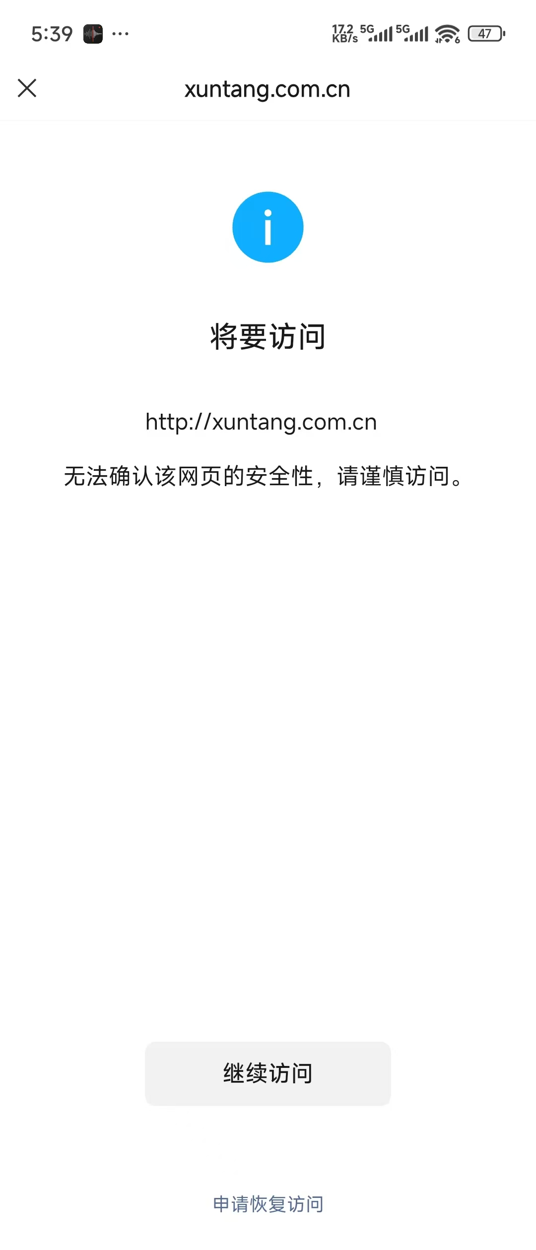 你好,经核实,域名【xuntang.com.cn】下的链接【http://xuntang.com.cn】链接内容严重违反《微信外部链接内容管理规范》的第19条“恶意违规及对抗行为”,不予恢复微信内直接访问的服务。