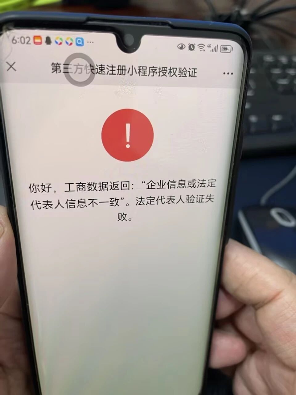 第三方快速注册小程序,法人人脸验证时返回这个,申请的信息已核对无误,企业名称和法人信息都和营业执照一致,企业主体名称“广西壮族自治区环境保护科学研究院(广西壮族自治区环境保护对外合作交流中心、广西壮族自治区环境保护技术中心)”,挺着急的,麻烦尽快帮忙看下