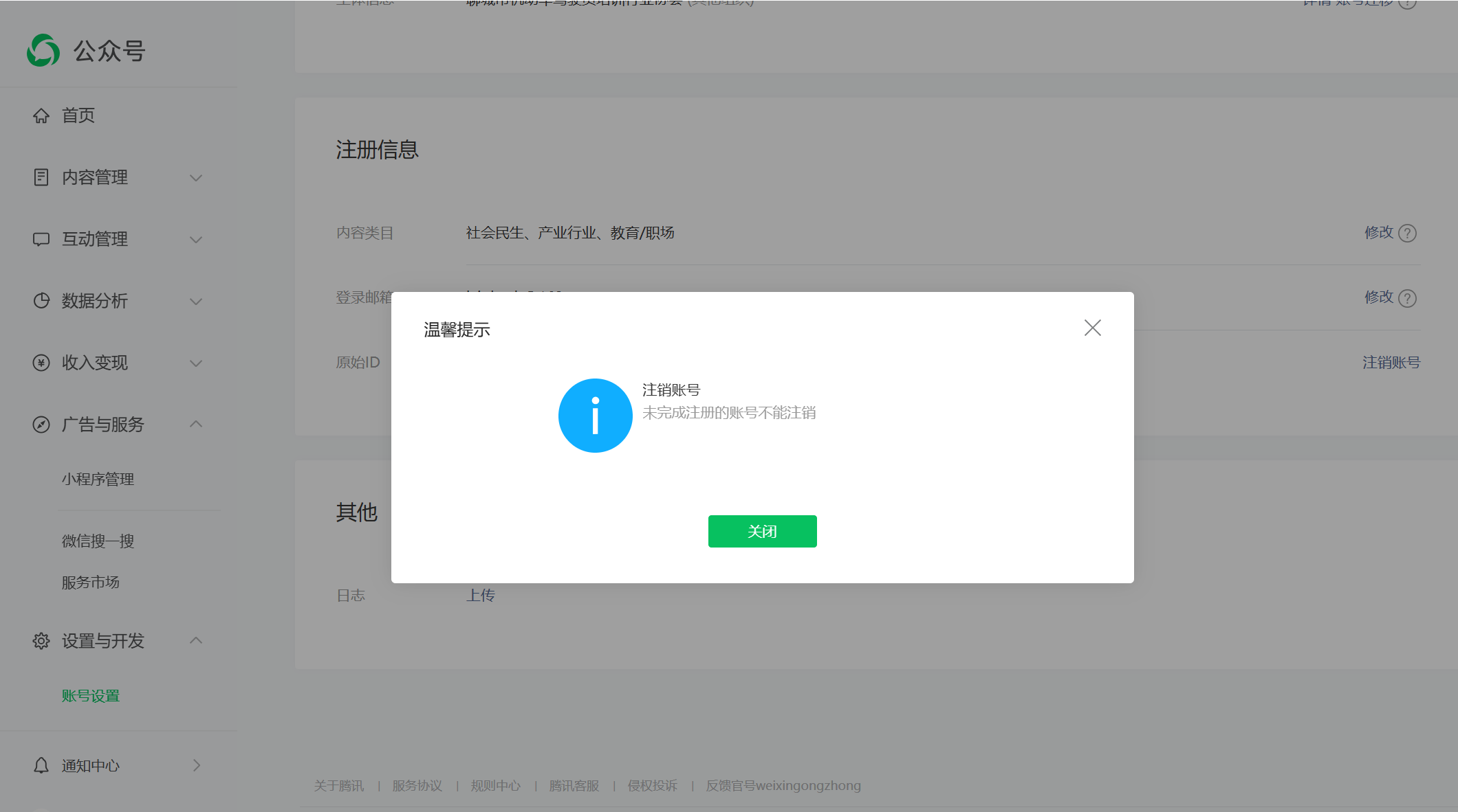 微信公众号在注销时显示未完成注册的账号不能注销,需要怎么解决。