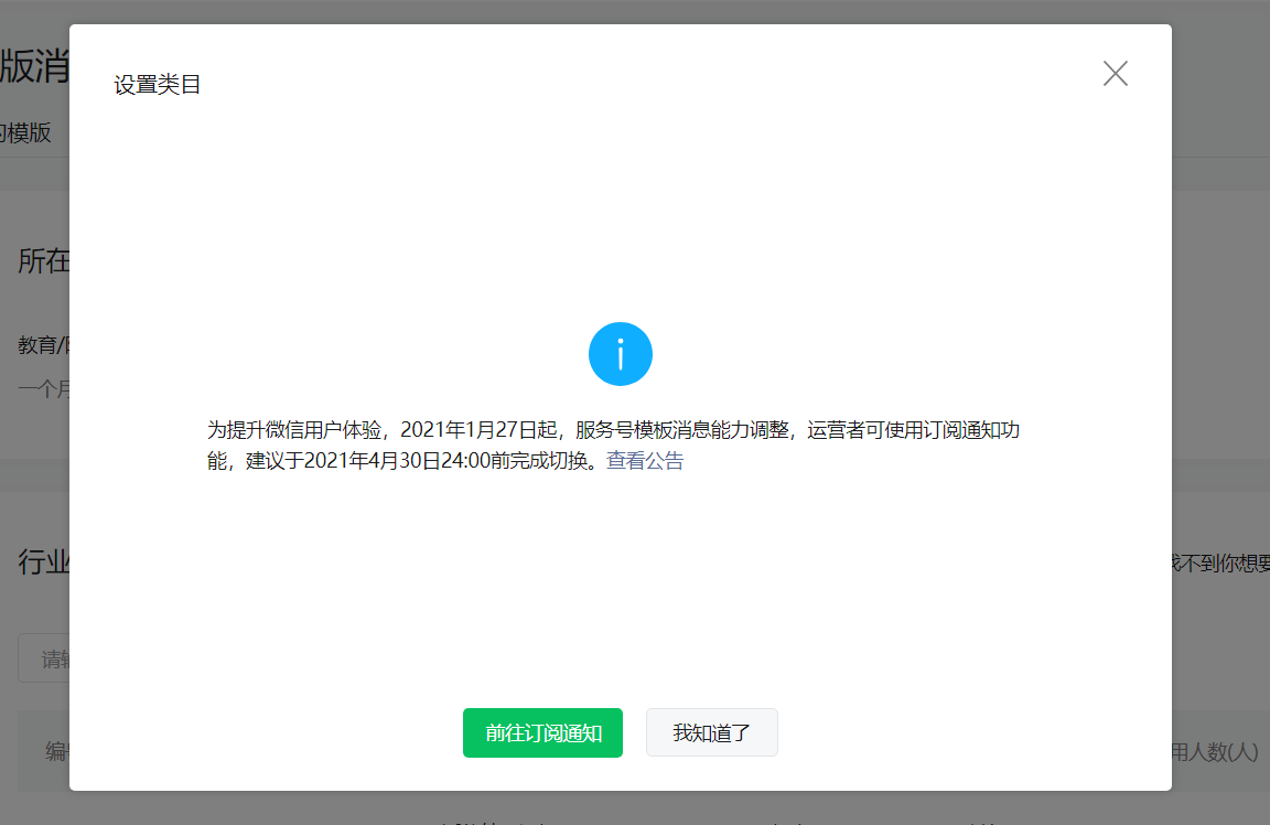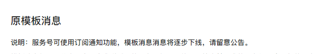 你好,为提升微信用户体验,2021年1月27日起,服务号模板消息能力调整,暂停行业修改、模板添加及新模板提审,已添加至私有库的模板暂不受影响。运营者可使用订阅通知功能,建议于2021年4月30日24:00前完成切换。