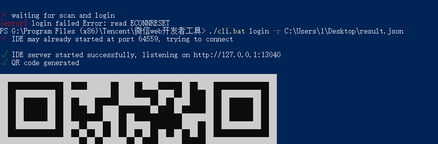 PS G:\Program Files (x86)\Tencent\微信web开发者工具> ./cli.bat login -r C:\Users\1\Desktop\result.json
