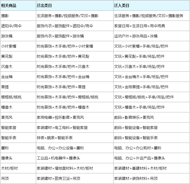 为契合市场发展,使商品所属类目更符合消费者购物习惯,平台将对部分商品所属类目进行迁移。
