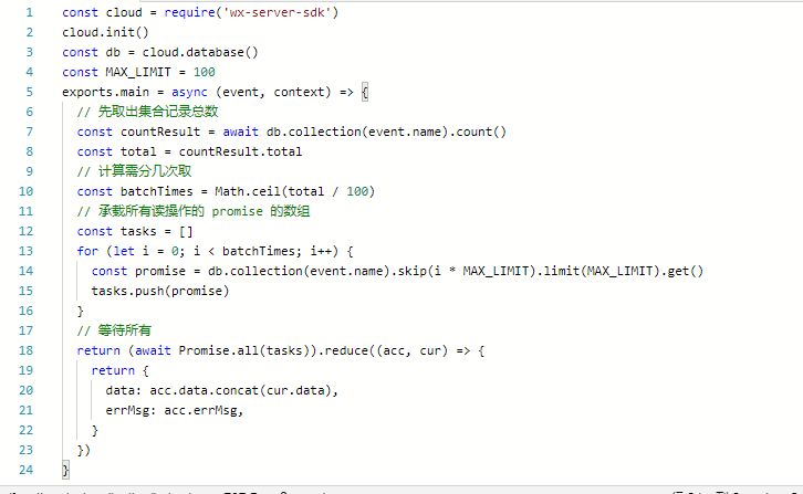 使用云函数获取云数据库中某个集合的全部数据时不成功,错误码为-501004,对应问题为:请求并发数超出环境配额,云函数代码如下图。