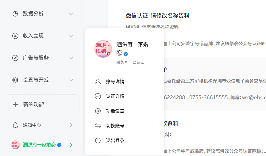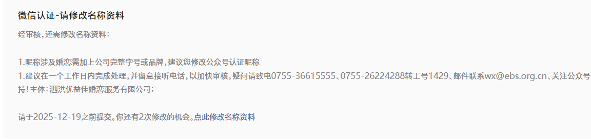 泗洪有一家婚恋为泗洪优益佳婚恋服务有限公司微信服务号认证名称,该名称自2021年开始使用至今,一直正常使用,没有侵犯任何人的商标和权利,也没有任何违规行为,更没有平台规则所说的“恶意误导或混淆他人的账号名称”的行为,过往认证审核也没有任何问题,请查证予以通过!谢谢