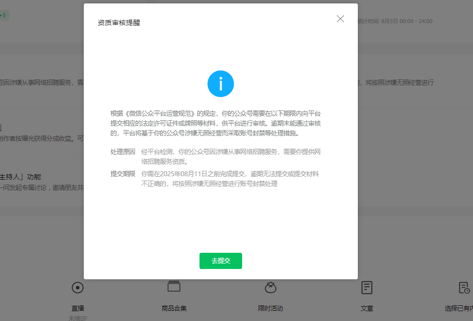 公众号要求提交资质,已经删除发布文章,需要提交相关资质吗?