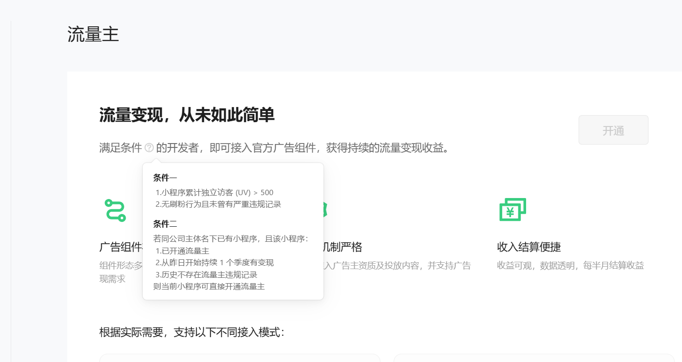你好,开通条件满足任一即可,无需同时满足。若公司仅有一个小程序,需满足条件一才可申请开通流量主。