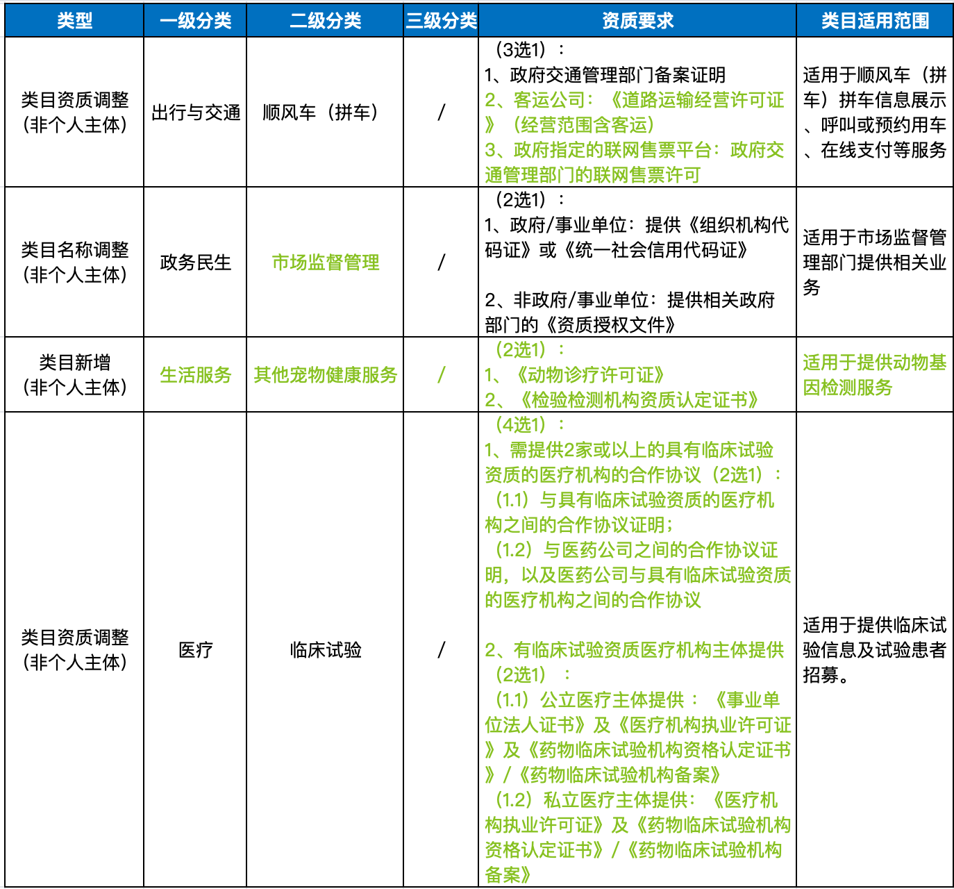 备注:绿色字体为小程序类目的更新调整,详情请参考小程序开放的服务类目