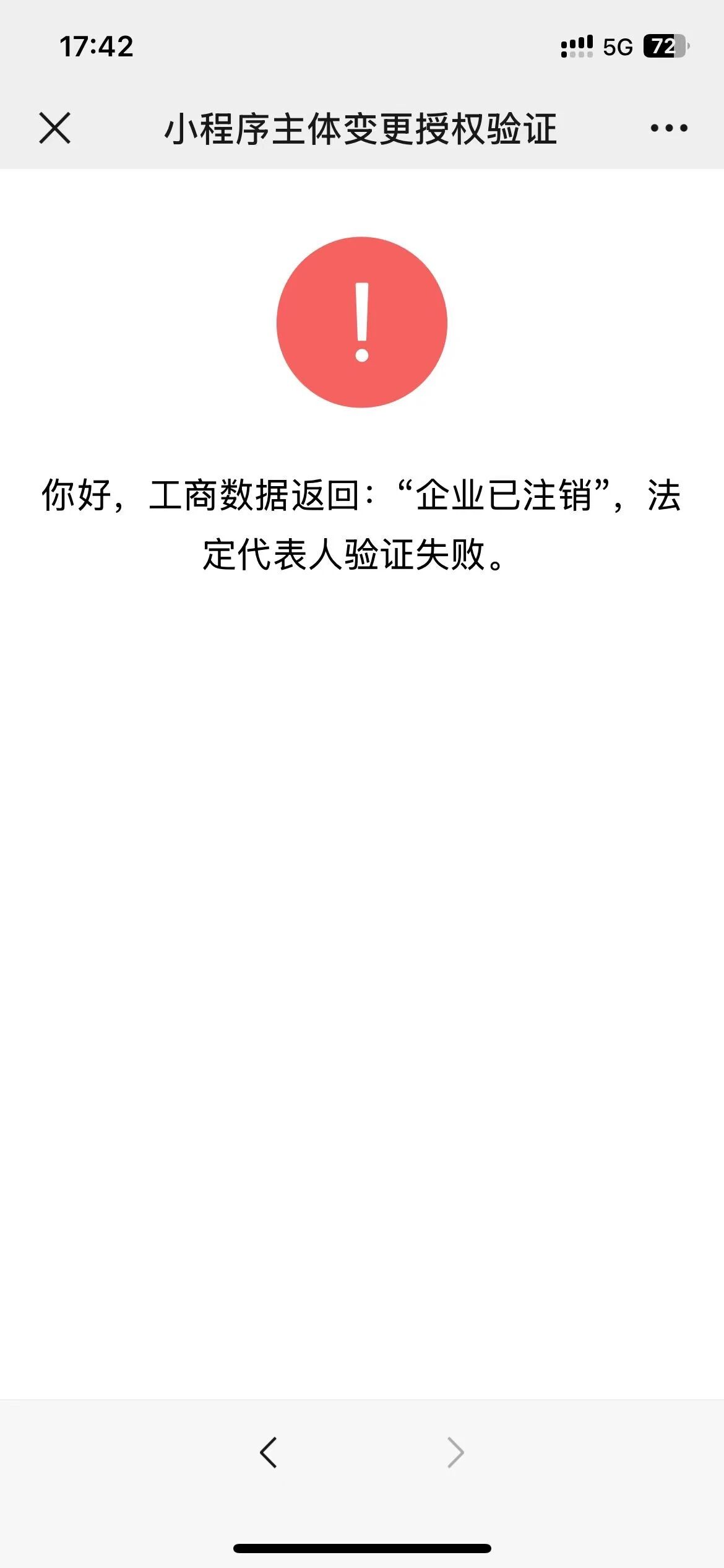 申请的小程序(原始id:gh_98efb8103a36)做主体变更申请,在验证的时候,因原营业执照已注销,导致原主体法人代表扫码验证,提示:企业已注销,验证失败