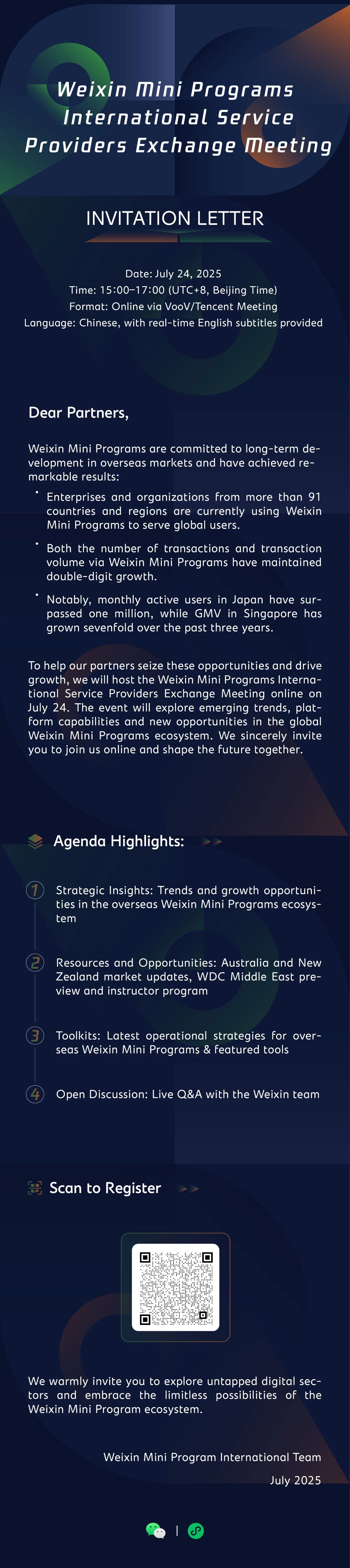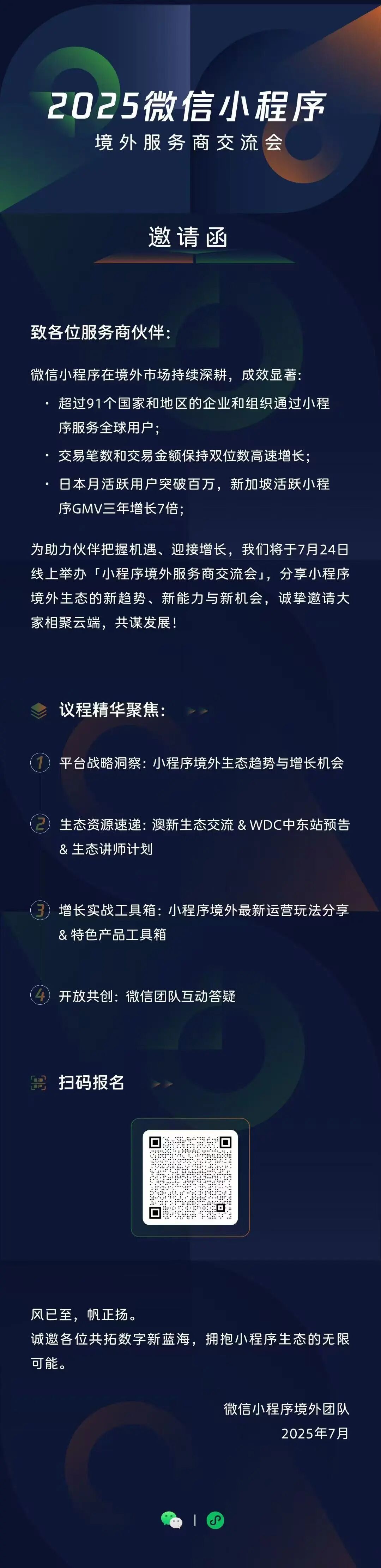 微信小程序境外业务团队将于 7 月 24 日线上举办「小程序境外服务商交流会」,分享小程序境外生态的新趋势、新能力与新机会,诚挚邀请大家相聚云端,共谋发展,填写下方报名链接或扫描下方海报二维码即可报名!