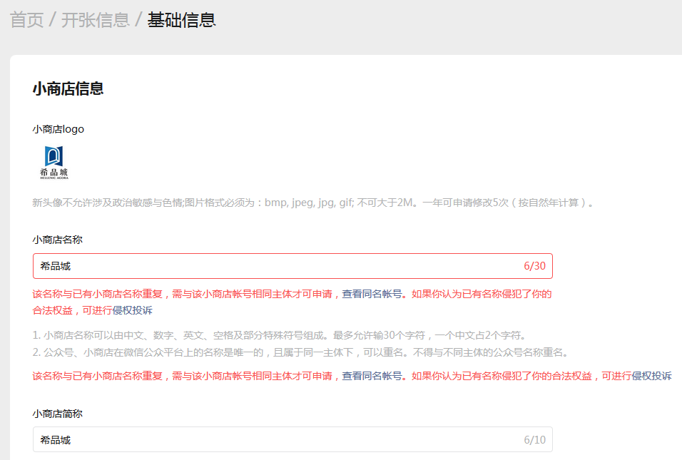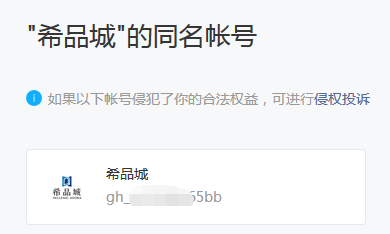 微信小商店开张的过程中,填写小商店名称的时候,显示该名称与已有小商店名称重复,需与该小商店帐号相同主体才可申请,我查看了同名帐号(如图一),有两个问题:1.这是属于同一主体的,都是属于深圳市希品城贸易有限公司的,公司信息昨天已经填写并且显示审核通过了;2.希品城公众号之前并没有开店。 因此,我们要怎样才可以用回“希品城”这个店铺名?