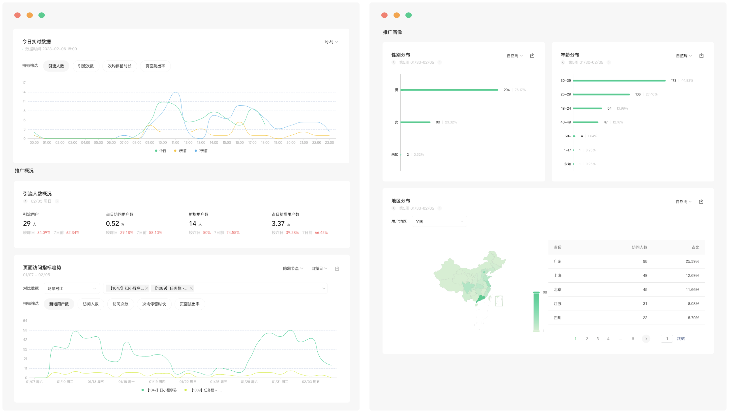 使用推广监测链接进行渠道投放,可查看渠道引流用户数、新用户数、分享人数、次均停留时长等基础数据,还有不同渠道/推广计划的引流人群画像、不同引流场景对比、推广计划以及推广素材的效果对比等进阶数据,帮助评估推广效果。