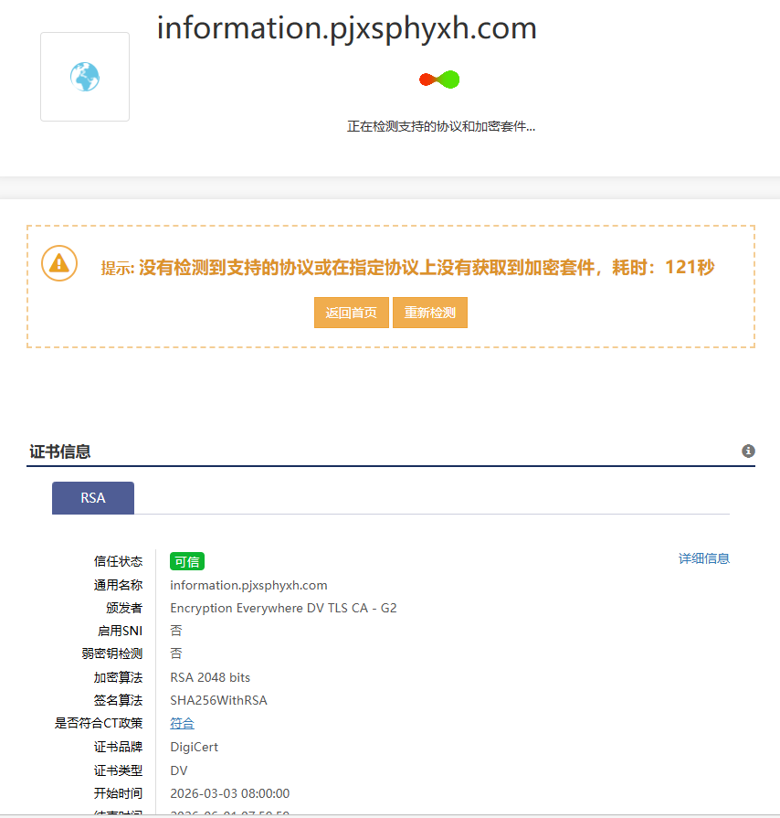 我在替换证书后,正式环境所有请求出现了Provisional headers are shown 的问题,目前证书检测的情况如下所示,我不清楚这个是否代表这个证书是可用的,还有就是这个域名在网页上访问是正常的,就只有小程序访问就访问不了后台,在编辑器工具里面勾选了‘不校验合法域名’去访问也不行。没有解决的思路了。