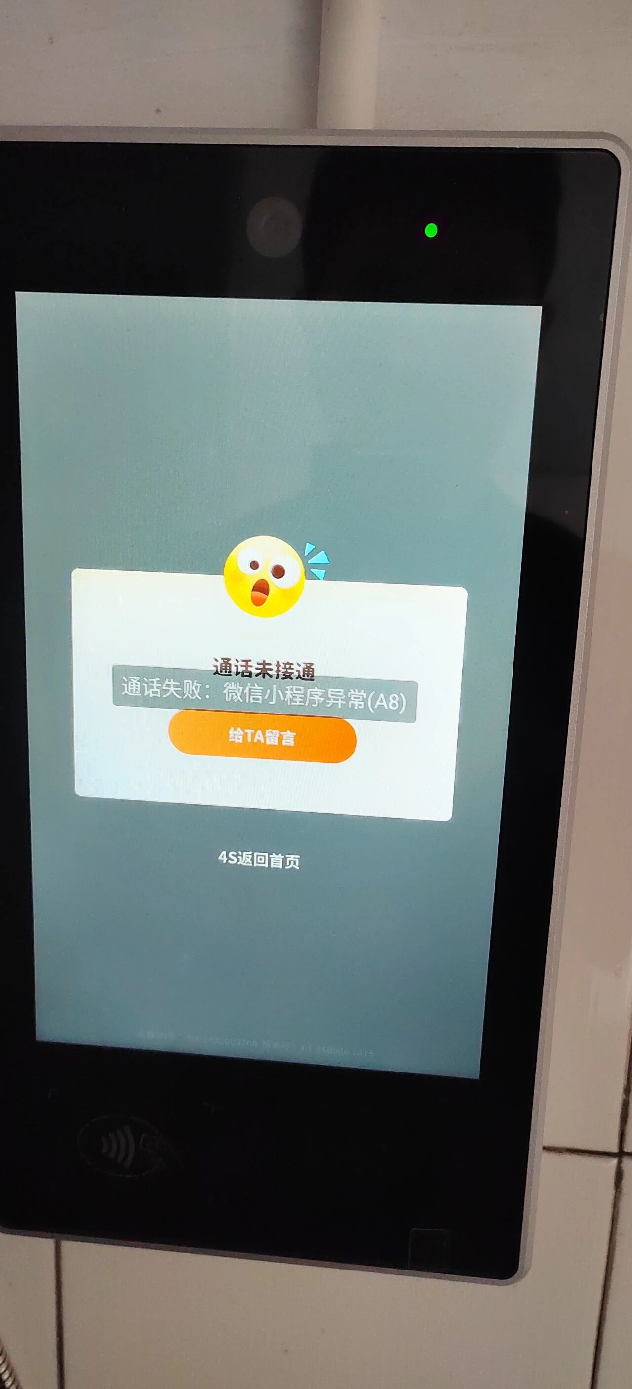 Request HangUpRequest HangUpRequest(api_ver=100, device_sn=3002402000265, trace_no=547d5e72a1074b36afbd1131034698fa, trace_time=20240327105335, machine_code=WX_MACHINE, call_type=2, user_no=49107390038240327103240074016871, school_id=6457, out_call_no=100010841111724032710533427834, voip_start_time=2024-03-27 10:53:34, voip_end_time=2024-03-27 10:53:35, terminal_keep_time=0, call_state=9, voip_call_event_info={"err_code":"A8","flow":[{"event_name":"startWxaFail","event_time":"2024-03-27 10:53:35","status":"微信小程序异常, EMMC IO"}],"is_auto_hand_up":false,"keep_time":0}, key_sign=6561f74cb124efeef55cea88cbbd2774)