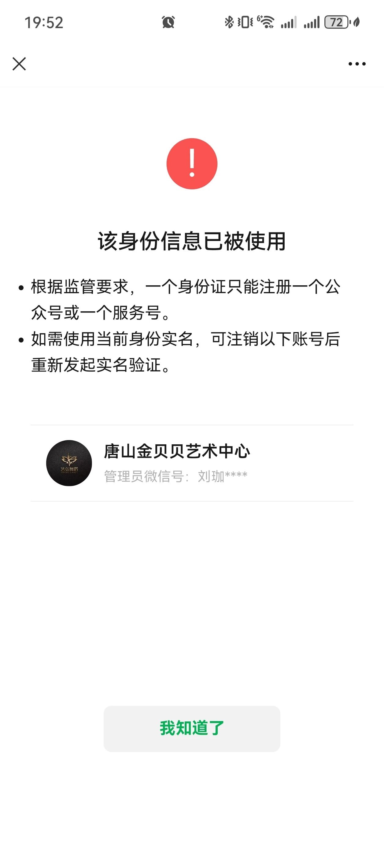 今天刚刚注册了一个公众号,想要做一个实名认证,提示我已经实名认证过一个公众号,不能再实名认证了,我联系了一下那个管理员,登录了一下,发现那个公众号已经显示系统注销了 ,那为什么我这里还是不能实名认证呢?