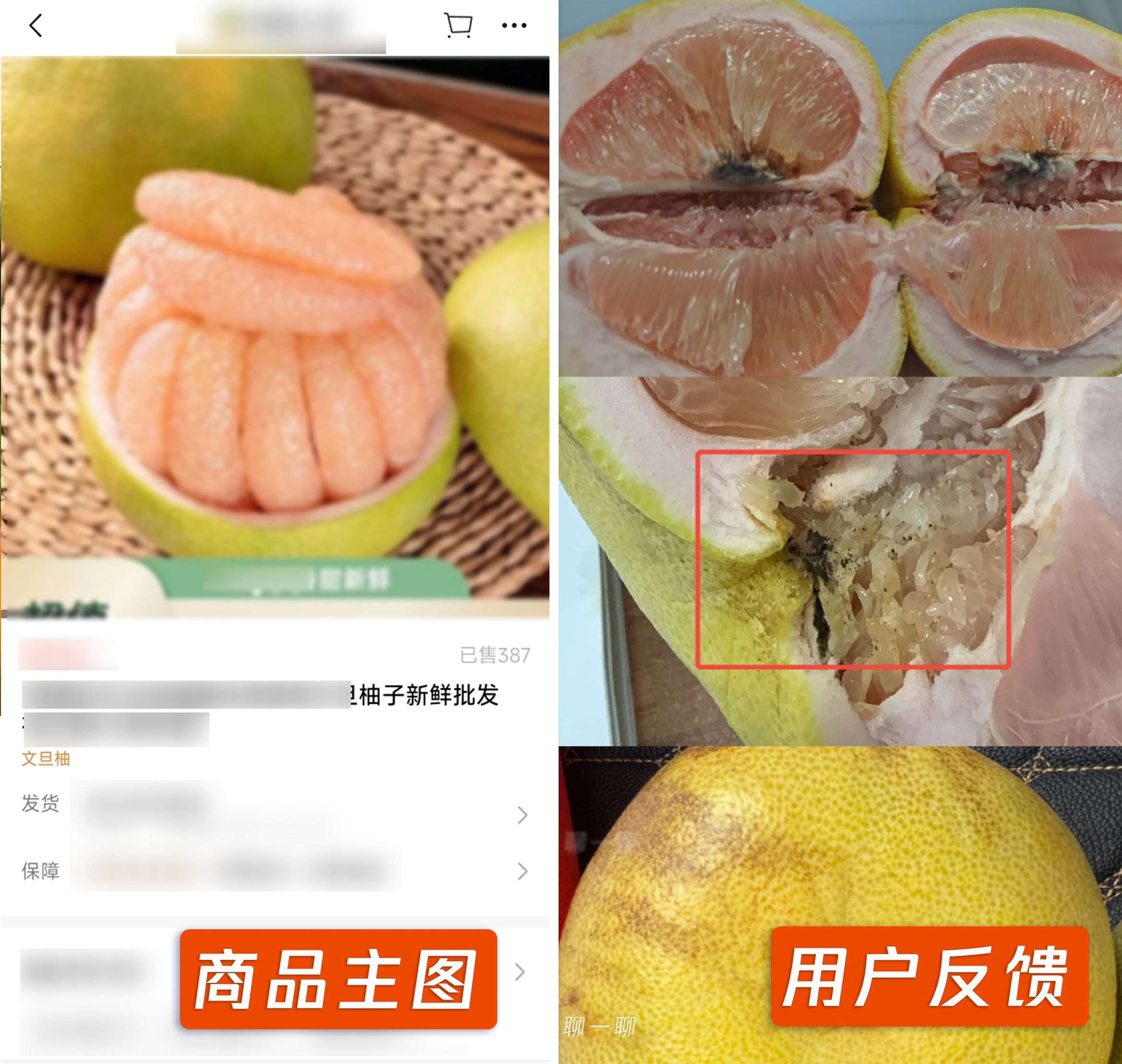 商家在柚子商品链接中展示了"果皮光滑、果肉饱满水润"的主图,并在商品标题等文字信息中明确标注品质新鲜。然而用户收货后,大量反馈实际收到的商品存在“果实粗糙干瘪”“霉变”“腐烂”等严重品质问题。此类商品品质不达标的问题直接影响用户购买体验与合法权益。