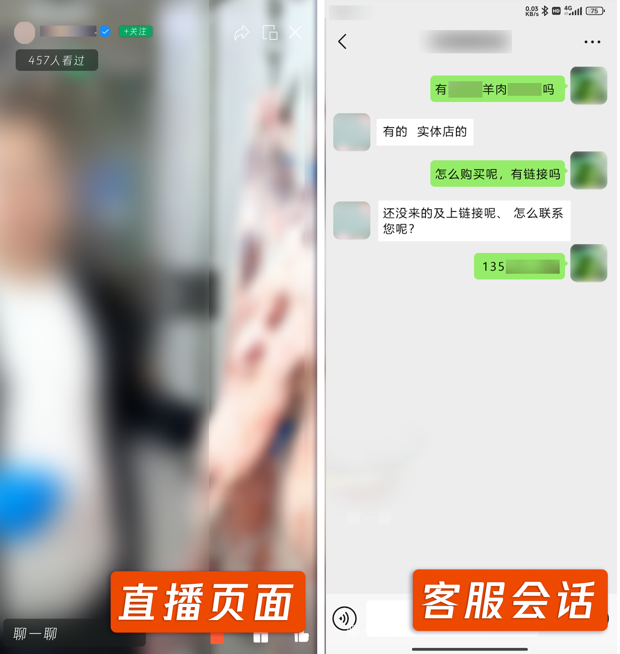 商家/带货者在直播间展示生鲜商品,但并未上架对应商品的购买链接,未在微信小店内产生实质交易。当用户通过客服功能进行咨询时,商家/带货者主动索要私下联系方式或引导用户添加其联系方式,旨在将交易引导至平台之外完成。此类“无交易但通过客服引流”行为,规避微信小店的交易监管与安全保障体系,可能使消费者面临售后无保障、资金损失等风险。