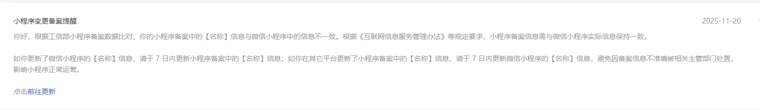 收到小程序变更备案提醒:根据工信部小程序备案数据对比,你的小程序备案中的【名称】与微信小程序中的信息不一致。如何处理,是修改小程序名称,还是重新备案?如何查询工信部备案的小程序名称?