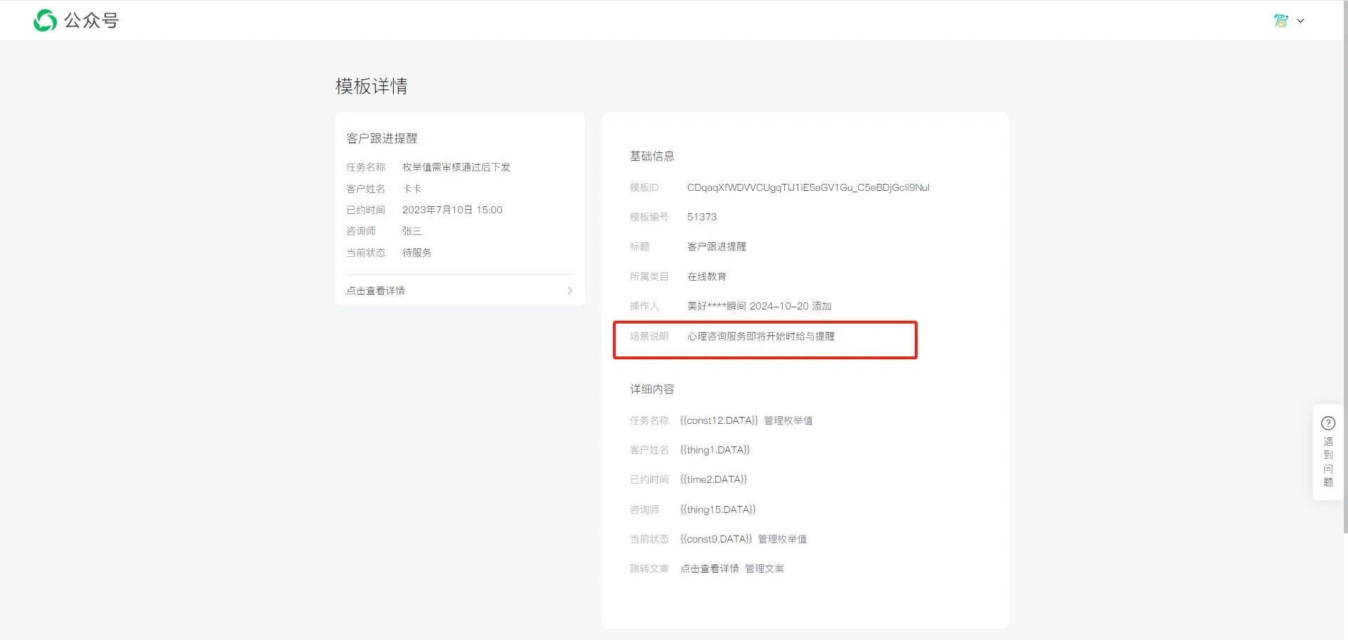 2、该模板所属类目为“教育服务-在线教育”,与提审的心理咨询场景不匹配,建议在相关类目模板下重新提审,如:医疗服务