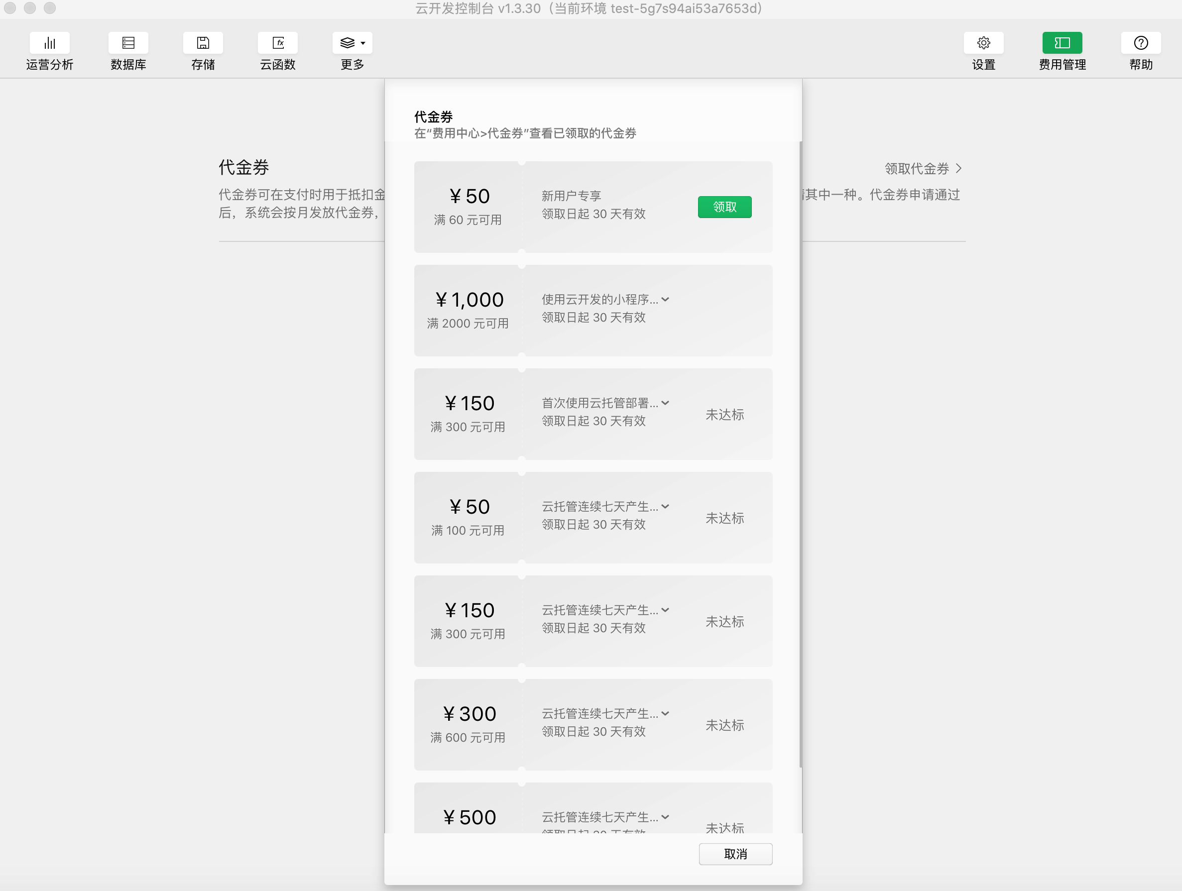 为助力开发者以更低的资源成本实现小程序的功能迭代,小程序云开发提供了代金券,符合条件的开发者可前往 最新版开发者工具-云开发控制台-费用管理 中的代金券模块查看并领取代金券。