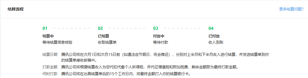 你好,腾讯公司将在次月 1 日和次月 15 日前(如遇法定节假日,将会推迟),分别对上半月和下半月收入进行结算,并在结算完成后3个工作日内,发送结算单到你的结算单邮箱中。待结算完成会流转至“已结算金额”,且在下方的【结算记录】板块可以查看对应结算区间的结算状态。