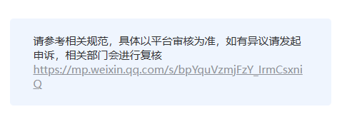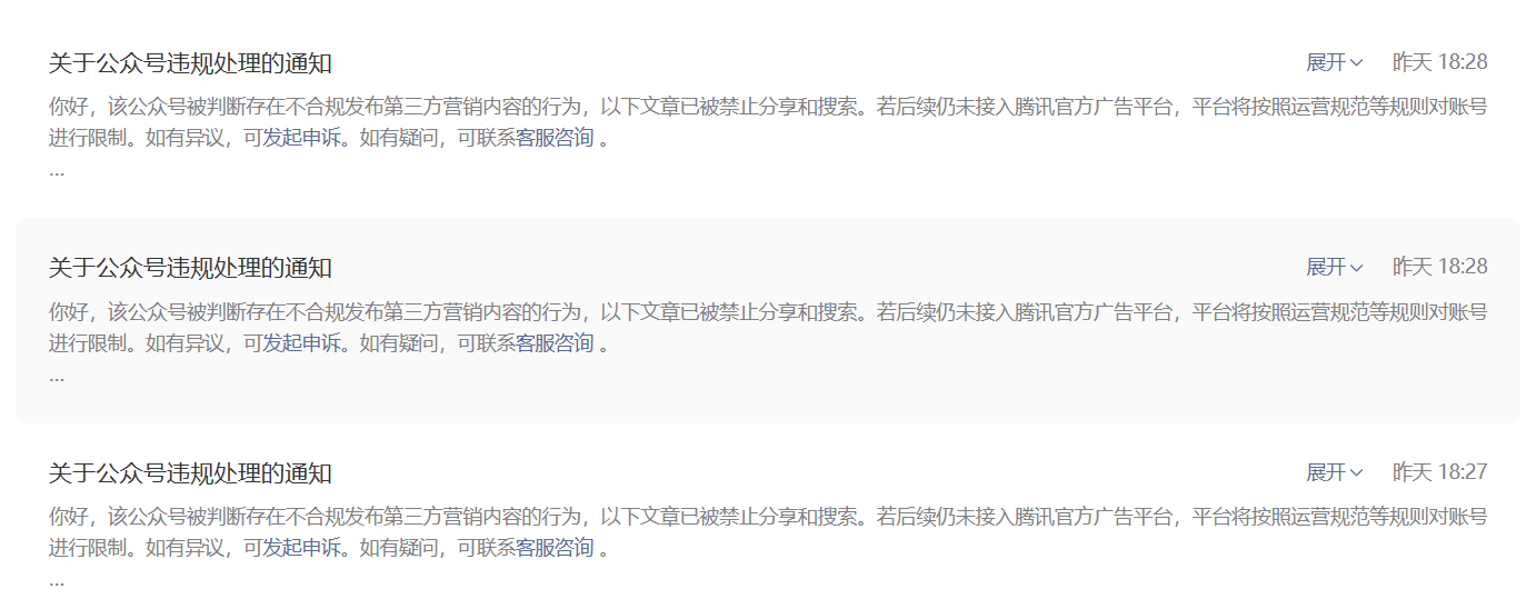 每次申诉后都是申诉成功,联系客服,客服也只会说平台审核无法规避,具体以发布后是否收到违规通知为准,申诉通过文章恢复,下发的处罚会撤销,不会影响公众号后续运营!但我们正常的科普文章,数据也不错,结果也突然收到的违规通知,真纳闷啊!有没有人帮忙解决的一下!每天申诉也很痛苦啊