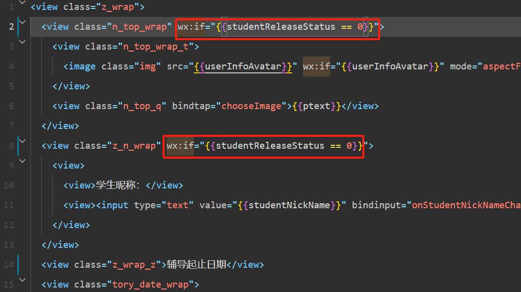 如下图,在view标签内部写了wx:if=函数,console.log也打印出了studentReleaseStatus确实也等于0 ,但是对应的上传图像和学生昵称小程序页面却没有展示出来,这是为什么?