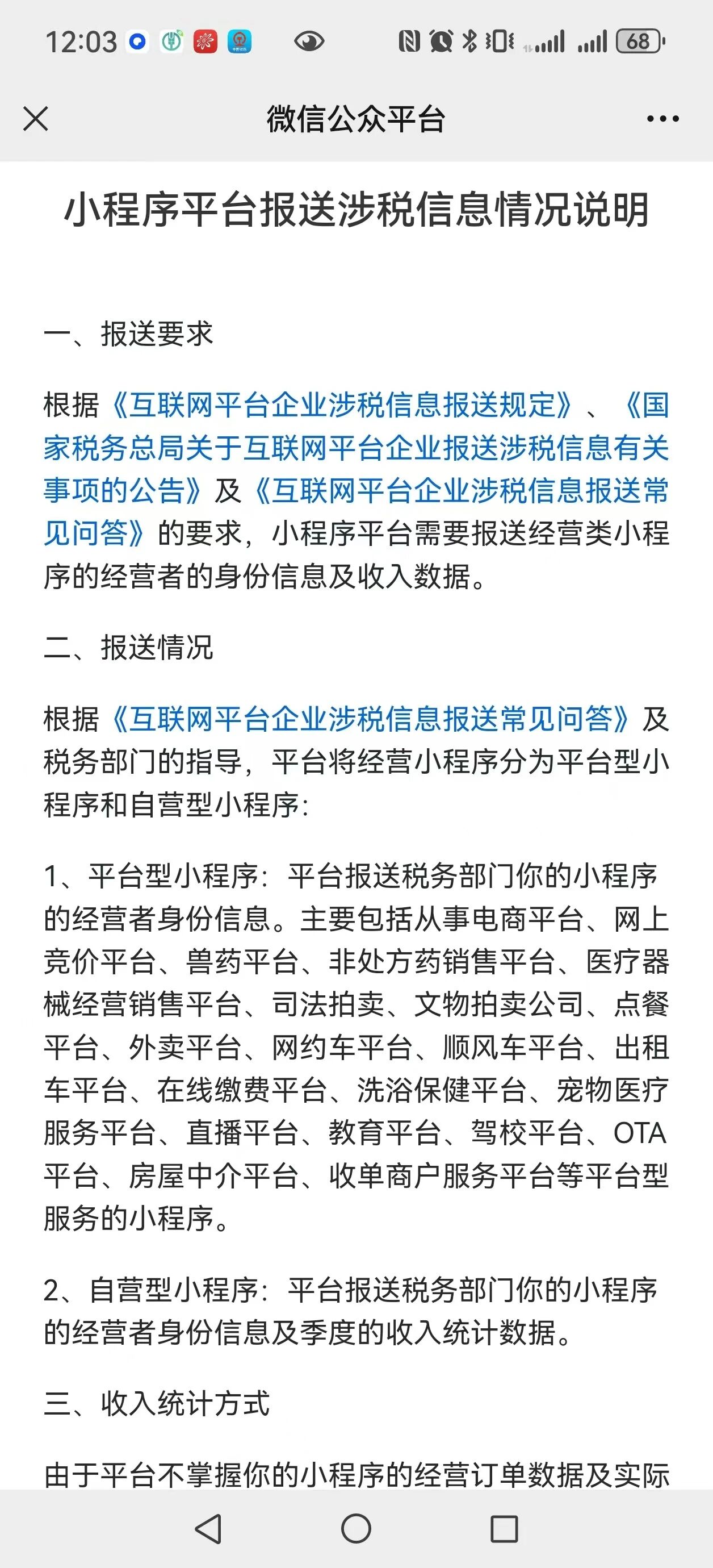 依法纳税是小程序开发者应尽的义务,请高度重视税务合规,平台建议你务必如实汇总在各平台以及线下其他渠道取得的全部应税收入,按税收法律法规要求的时限和内容进行纳税申报。具体报送方式可以和你的主管税局联系。