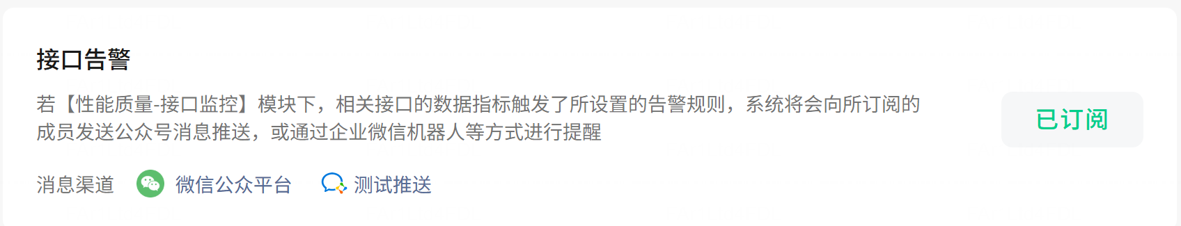 已经订阅,接口监控-业务接口有数据上报,图表里有数值,订阅消息推送不生效,之前使用过2025年9月份的时候有消息推送,后面就一直没推送消息。已经配置了企业微信机器人,其他都检查正常,只是最后没有推送消息。