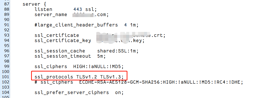 - 在nginx的配置文件nginx.conf中,配置的ssl_certificate和ssl_certificate_key有分别指向存放在\usr\local\nginx\conf\路径下的.crt和.key证书文件,且浏览器能通过https访问web网页也证明该配置无误。文件中也有添加了对1.3版本的tls的支持:ssl_protocols TLSv1.2 TLSv1.3。所以这个配置信息应该也是没有问题的,因为这个配置文件在服务器重装之前几乎是一样的信息,只有ssl_certificate的配置不同而已,重装系统前这个参数是指向.pem文件,按理说应该这个参数指向.crt和.pem都是可以的。