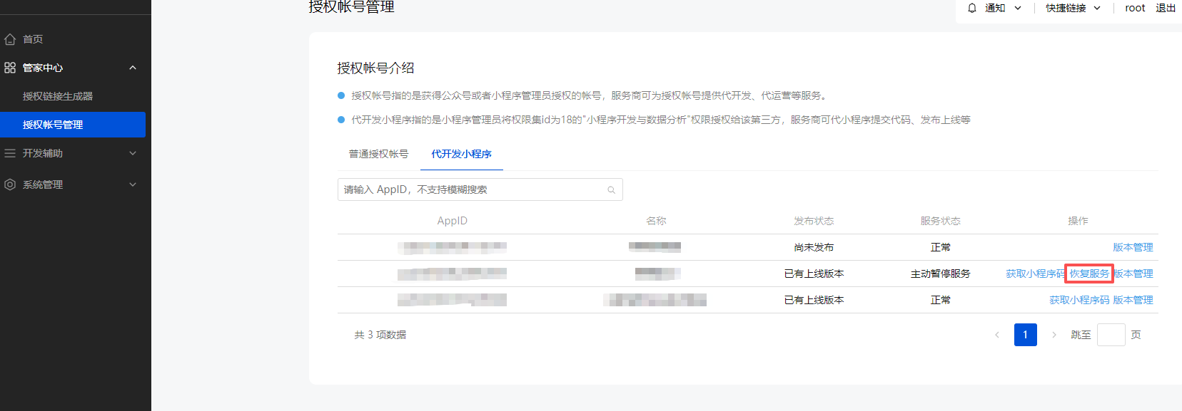 你好,核实微管家服务已经不维护,有需要或者运行有bug,自行查看源码(https://github.com/WeixinCloud/wxcloudrun-wxcomponent)调试或者自行开发,可切换传统模式自研。