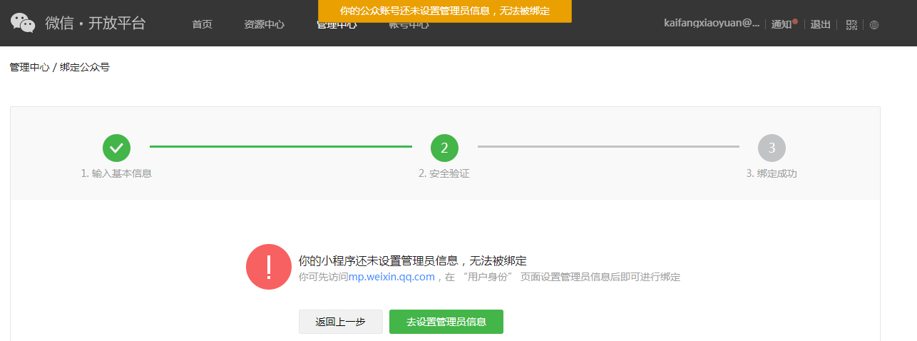 认证以后,绑定公众号,总是提示没有绑定管理员,但是已经绑定管理员了。