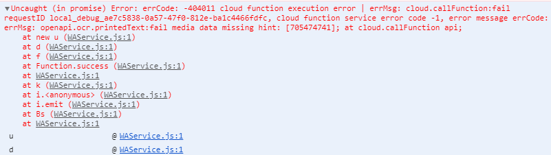 在使用 ocr.printedText API 的过程中,出现了 fail media data missing,从字面上看,像是未传入有效的值(Buffer 或 url),但检查了下代码感觉没有什么问题。接口权限已在 config.json 文件中配置。