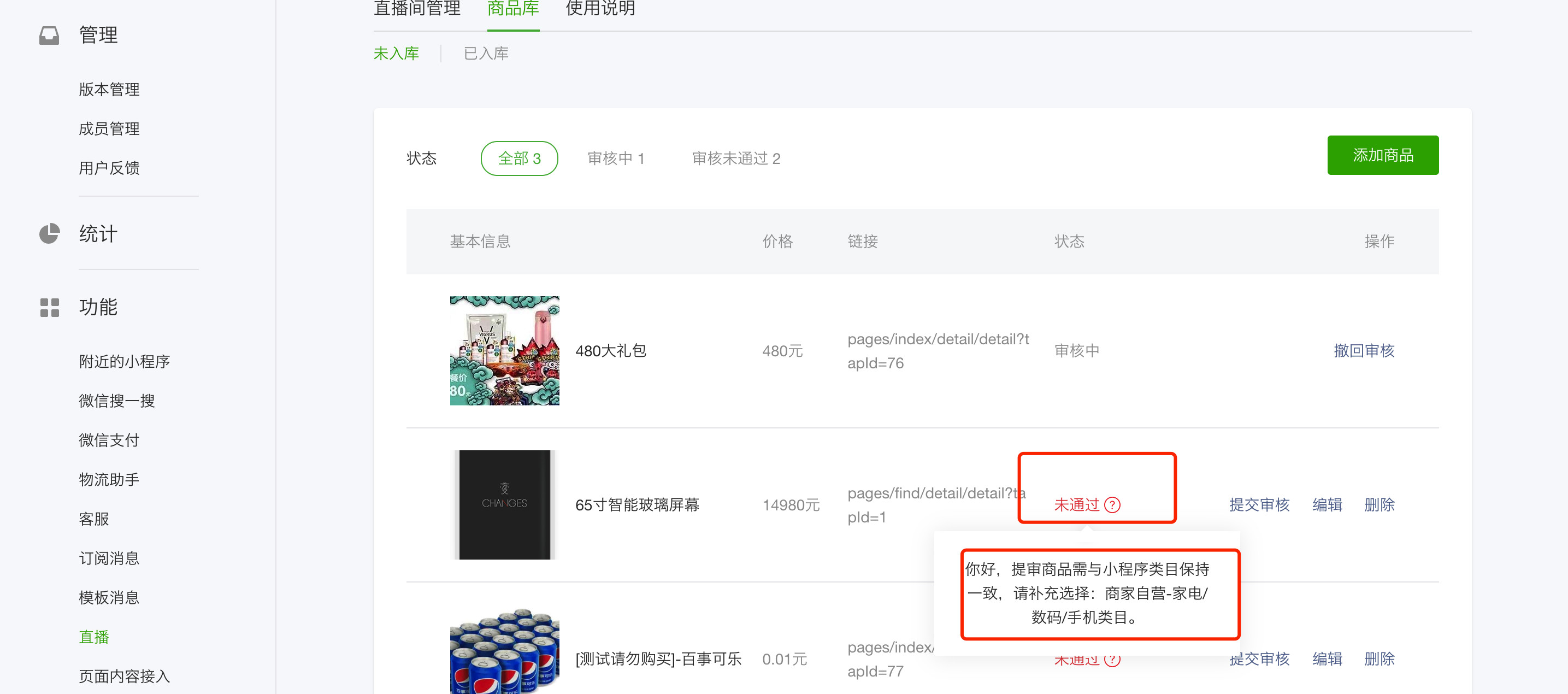 小程序直播商品审核不通过,原因是:你好,该商品属平台未允许直播售卖的商品,请修改商品内容后重新提交审核