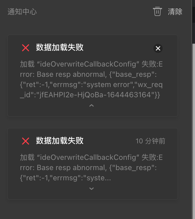 错误:加载 “ideOverwriteCallbackConfig” 失败:Error: Base resp abnormal, {"base_resp":{"ret":-1,"errmsg":"system error","wx_req_id":"MfEAHPI2e-V_S2CA-1644463579"}}
