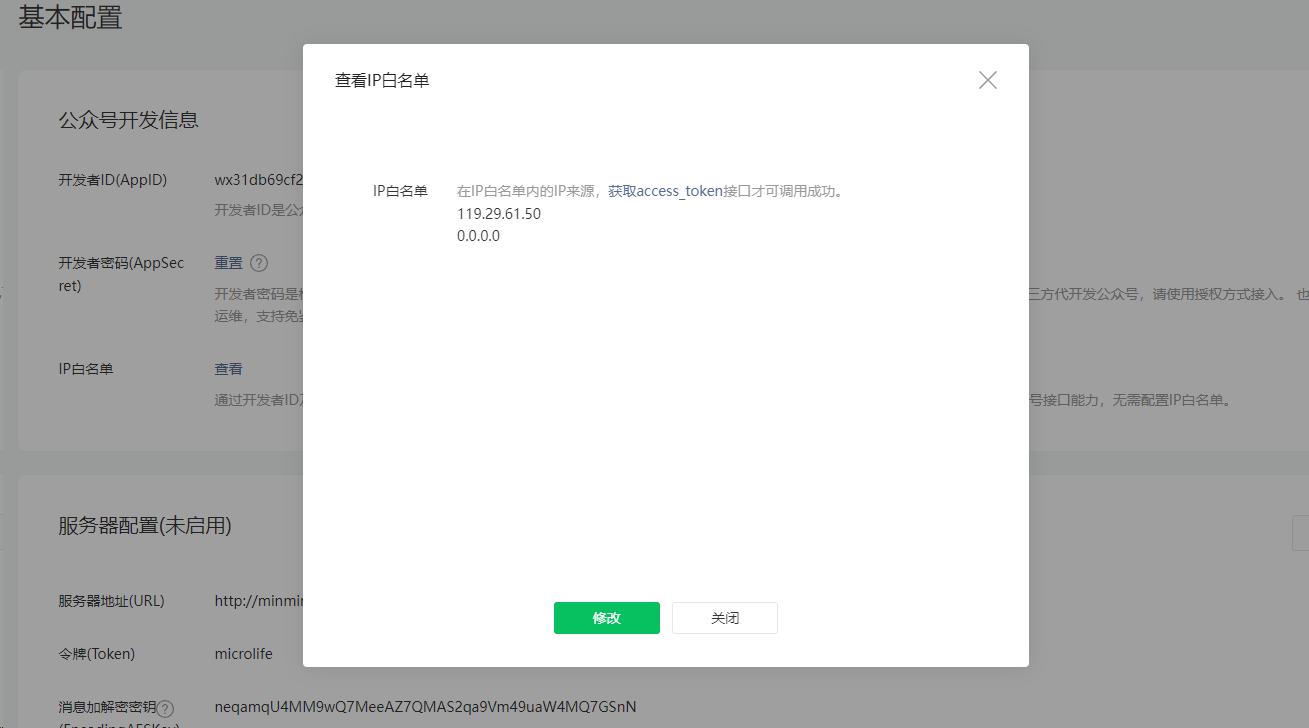 我在公众号的白名单里设置了我的公网静态ip,但是调用时还是ip无效(我已经用官方工具测试了,appid和APPSECRET是正确的)