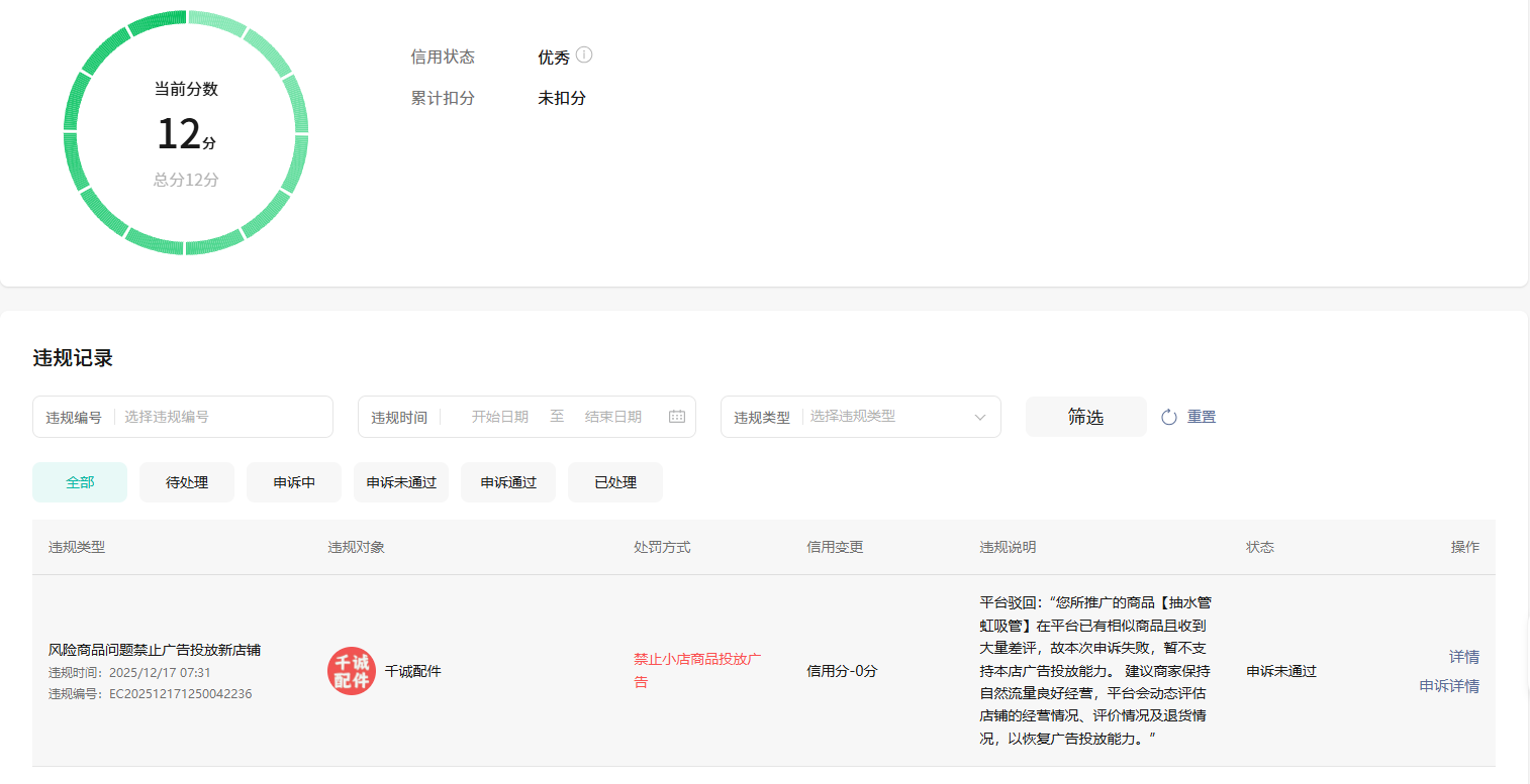 我的小店在25年12月17号就提示“风险商品问题禁止广告投放新店铺",只是因为平台存在相似商品有差评就给我封禁到了现在,问客服一直让观察经营,问需要达到什么指标才给解封,只说让观察。好评率做到了百分百依然是这个回复,太不负责了。