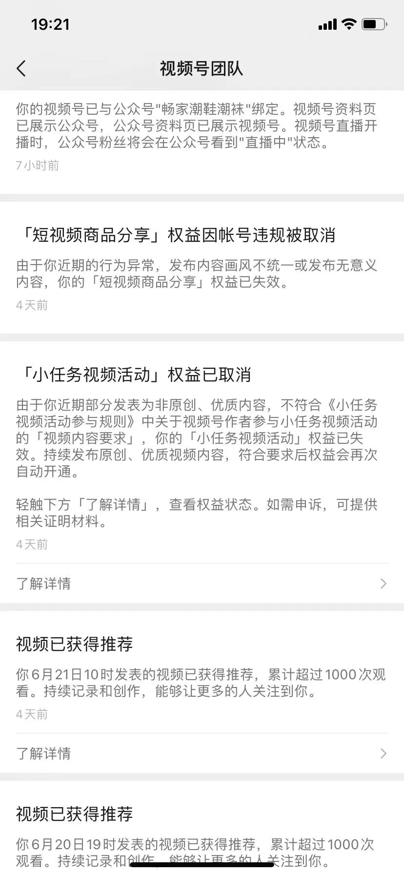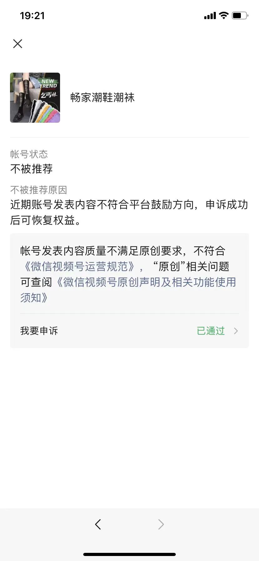 视频号:畅家潮鞋潮袜 视频号ID:sphERdKQo89VDrv 按照官方给的申诉链接 :申诉成功 请复制申诉链接(https://channels.weixin.qq.com/pandora/pages/appeal/index#account-detail?appeal_entrance=1)在手机微信打开,按照提示进行线上申诉即可。这个点开申诉也是成功的,但是任然权益是被封状态!!!主要是账号不被推荐状态,系统错乱了!求解决!仓库还有好几十万的货备着呢!但是是找到不到人工客服,发了无数封邮件,无果! 也私信了@社区技术运营专员-channels 但是也不知道有没有人工客服,还是都是机器人,视频号被系统误封了收到2个私信 小视频活动权益 和商品视频分享权益,关键视频还不被推荐 , 点开违规详情:申诉成功 视频号被系统误封了 小视频活动权益 视频不被推荐 , 违规详情:申诉成功 希望我的这条视频能被工作人员看见,帮忙处理下!我是原创作者,我可以提供我任何一个视频的原创场景 道具 商品 !视频号账号诊断:近期视频无异常 账号状态正常 直播:100分状态正常 求平台处理!